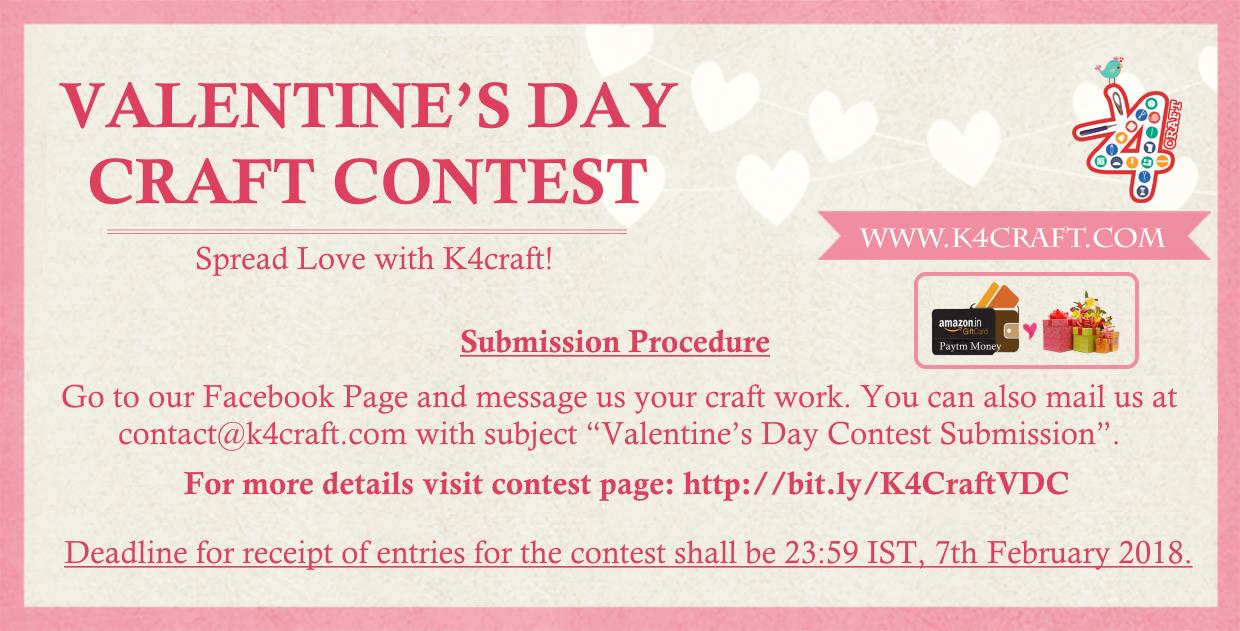 - Go to our Facebook Page and message us your craft work. You can also mail us at contact@k4craft.com with subject “Valentine’s Day Contest Submission”.