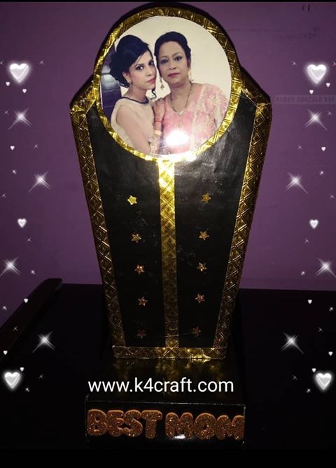 Procedure:- *Take a cardboard n draw a shape of trophy you wish * Cut out the trophy neatly *cover it with black sheet *Cut a strip of golden sheet & paste it * Decorate it with Stickers.