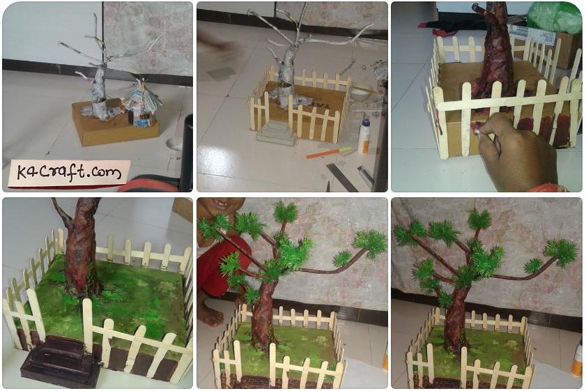 Cardboard box, newspapers, fevicol, wire, fevicryl colors, cutter, ice cream sticks, plastic grass, small pebbles.