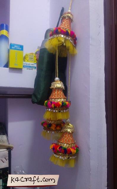 - Then i cover it with colored dori and gota then I use net which I got for some packing return gift from marriage another waste material.