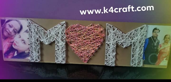 Cut the size of wood of your choice. You can stain or paint it. You can draw mom on paper or you can either search on internet * Place it on board and put nails into the paper (space them as evenly as possible) * Remove the paper * Start wrap wool around the nail (keep it tight) *Paste photograph *Decorate nail top with stones.